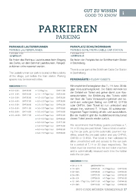 ÖV PUBLIC TRANSPORT AUTO BY CAR » 0.0 – 0.5 h CHF 00.00 » 1.0 Tag Day CHF 17.00 der Einfahrt ein Ticket und gehen damit zum Kas-